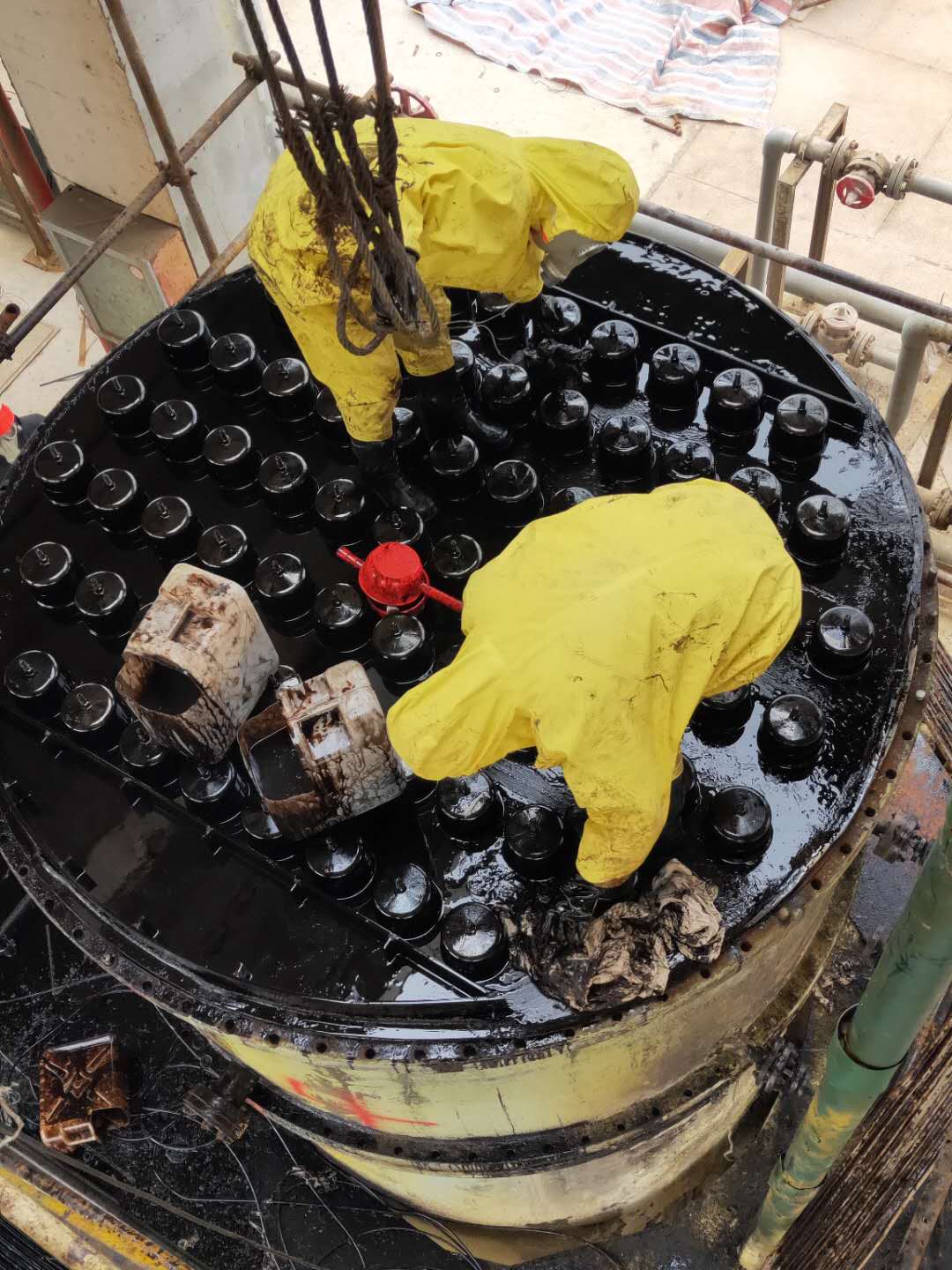 檢修現(xiàn)場,新員工在摸索中不斷前進大膽嘗試,在師傅的帶領(lǐng)下提高自身技能,相信這次檢修作業(yè)中他們會學(xué)到更多!在檢修期間,各裝置區(qū)對于施工現(xiàn)場布置可謂井井有條,忙而不亂,新員工協(xié)助老師傅開展工作,現(xiàn)場各類工量器具擺放整齊,信手拈來游刃有余,新舊棉紗分類,清洗油和廢油各有專用容器盛放,為快速、安全、高質(zhì)量檢修提供了有力保障。