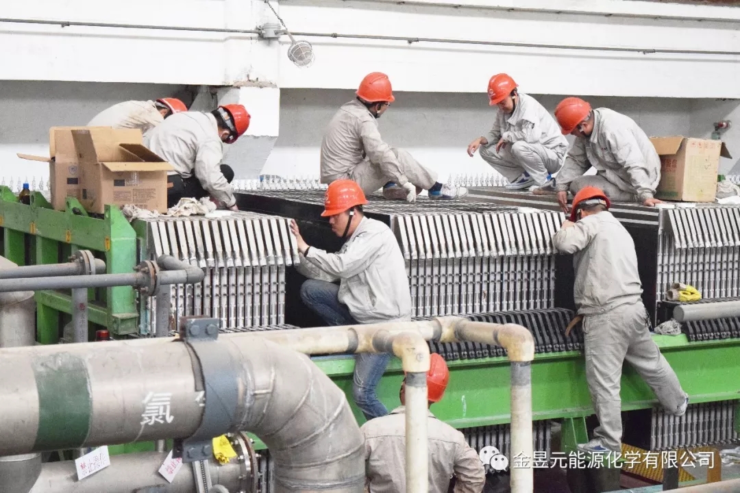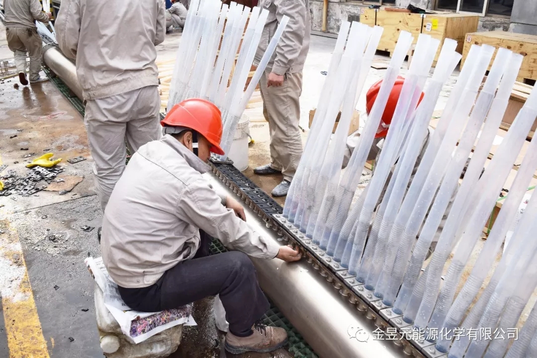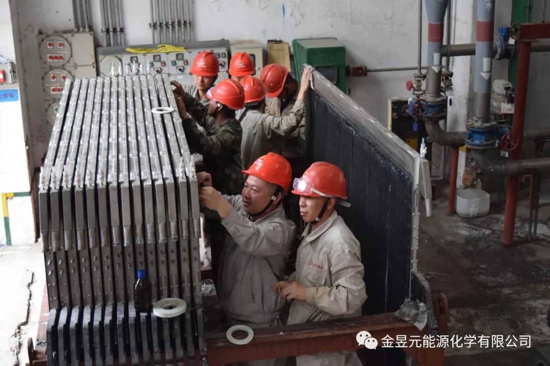 離子膜裝置B槽檢修作業(yè)現(xiàn)場,裝置將去年A槽檢修換膜總結(jié)的經(jīng)驗和方法充分運用到此次作業(yè)中,同時裝置檢修人員積極與廠家技術(shù)人員在鏟膠、貼膠、貼膜等作業(yè)方法和技術(shù)上進行廣泛的交流學(xué)習(xí),有效加快了檢修進度。