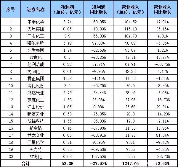 上市公司2019年度的半年報(bào)已披露完畢。廣東塑料交易所統(tǒng)計(jì)了新疆天業(yè)、中泰化學(xué)、英力特、鴻達(dá)興業(yè)等20家氯堿行業(yè)上市公司上半年的業(yè)績情況,合計(jì)實(shí)現(xiàn)營收1247.66億元,同比增長12.96%,凈利潤52.38億元,同比下降27.93%;雖然利潤出現(xiàn)下滑,但上半年這20家上市公司全部實(shí)現(xiàn)盈利。