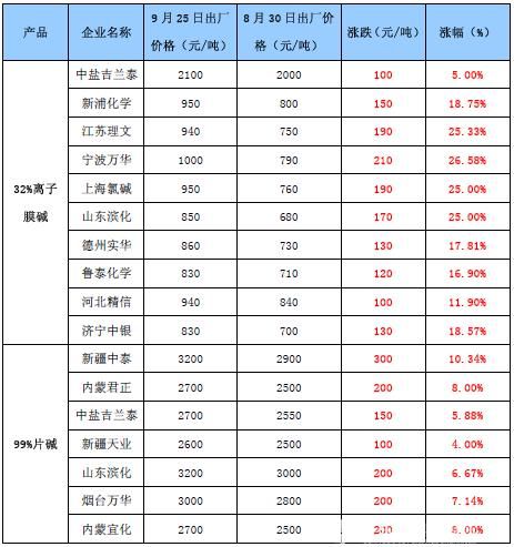 進入9月,國內(nèi)燒堿市場終于打破7月以來的平衡狀態(tài),價格出現(xiàn)迅猛上漲走勢。截至9月25日,山東地區(qū)32%離子膜堿市場均價上漲135元/噸至800元/噸,漲幅為20.3%,內(nèi)蒙地區(qū)99%片堿上漲200元至2650元/噸,漲幅為8.16%。相比而言,片堿市場表現(xiàn)相對溫和,液堿市場則更顯迅猛。