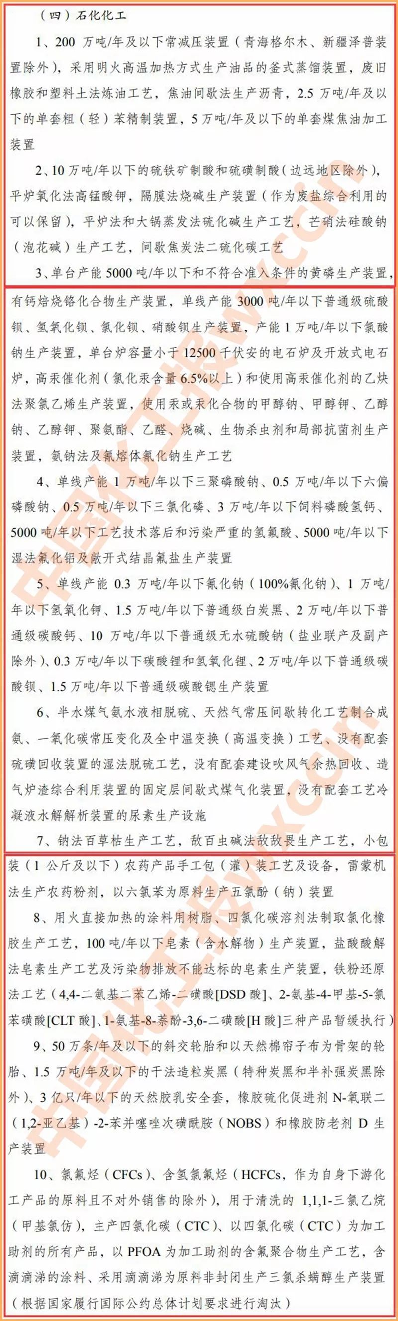 石化化工行業(yè)淘汰類有10大類,比征求意見稿少了2大類,包括:200 萬噸/年及以下常減壓裝置,2.5 萬噸/年及以下的單套粗(輕)苯精制裝置,5 萬噸/年及以下的單套煤焦油加工裝置;單臺產(chǎn)能 5000 噸/年以下黃磷生產(chǎn)裝置;半水煤氣氨水液相脫硫、天然氣常壓間歇轉(zhuǎn)化工藝制合成氨、一氧化碳常壓變化及全中溫變換(高溫變換)工藝、沒有配套硫磺回收裝置的濕法脫硫工藝,沒有配套建設(shè)吹風(fēng)氣余熱回收、造氣爐渣綜合利用裝置的固定層間歇式煤氣化裝置,沒有配套工藝?yán)淠核饨馕鲅b置的尿素生產(chǎn)設(shè)施;鈉法百草枯生產(chǎn)工藝,敵百蟲堿法敵敵畏生產(chǎn)工藝,雷蒙機法生產(chǎn)農(nóng)藥粉劑,以六氯苯為原料生產(chǎn)五氯酚(鈉)裝置等。