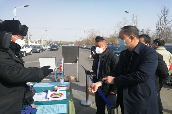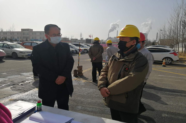 金永靈市長按常規(guī)程序進(jìn)行測量體溫和登記信息,并翻閱出入大門人員信息登記臺賬。他詳細(xì)了解了集團(tuán)公司疫情防控工作,總裁葉森和黨委副書記兼工會主席王立軍逐一回答。