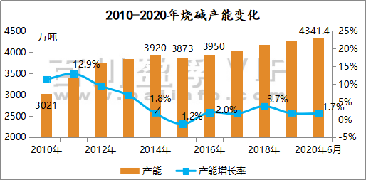 2016年在大宗原料價(jià)格開啟上漲通道后,中國燒堿產(chǎn)能增長率轉(zhuǎn)負(fù)為正。2020年6月末百川盈孚統(tǒng)計(jì)中國燒堿產(chǎn)能約4341.4萬噸。( 2015年大宗商品交易平臺價(jià)格的處于歷史最低水平,供給側(cè)改革降低了大宗商品交易平臺供給的彈性,使得價(jià)格暴漲成為可能)。