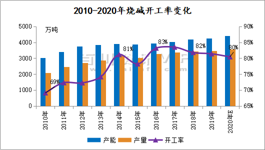 由此可見,2020年全國總產(chǎn)能實(shí)現(xiàn)穩(wěn)步增長,但整體增速相比同期有所下降,受全球公共衛(wèi)生事件沖擊,燒堿下游需求表現(xiàn)不佳,整體行情不甚樂觀。出于整體需求和供需平衡考量,預(yù)計(jì)未來產(chǎn)能增速將有放緩表現(xiàn),具體發(fā)展變化還需關(guān)注后續(xù)全球公共衛(wèi)生事件處置情況及市場行情實(shí)時(shí)變化。