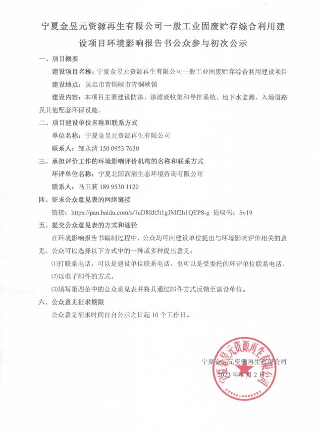 寧夏金昱元資源再生有限公司一般工業(yè)固廢貯存綜合利用建設(shè)項(xiàng)目環(huán)境影響報(bào)告書(shū)公眾參與初次公示