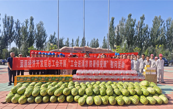 當(dāng)青銅峽市委、政府和固原經(jīng)濟(jì)開發(fā)區(qū)總工會的領(lǐng)導(dǎo)為金昱元股份公司奮戰(zhàn)在生產(chǎn)一線的員工們送上西瓜、飲料、茶葉、冰糖等防暑物品的時候,廣大員工對上級政府部門領(lǐng)導(dǎo)的關(guān)心和厚愛深表感謝。炎炎夏日,上級政府部門送來的關(guān)愛使員工們?nèi)玢宕猴L(fēng),深受感動。